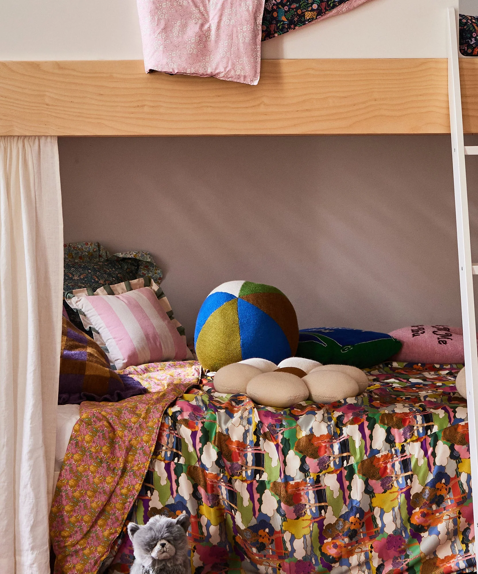 Our most playful pillow yet — a soft, sculptural sphere in a kaleidoscope of cheerful colors.Designed to brighten any corner, offering a pop of personality and a perfectly plush place to land.