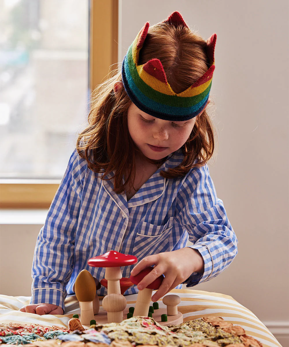 We adore the creativity & beauty of this sorting toy. A wooden plate features grass-like pegs, where seven unique mushrooms can be arranged (or played with separately). Beautiful décor in any space. One of the best play & display toys we've found.